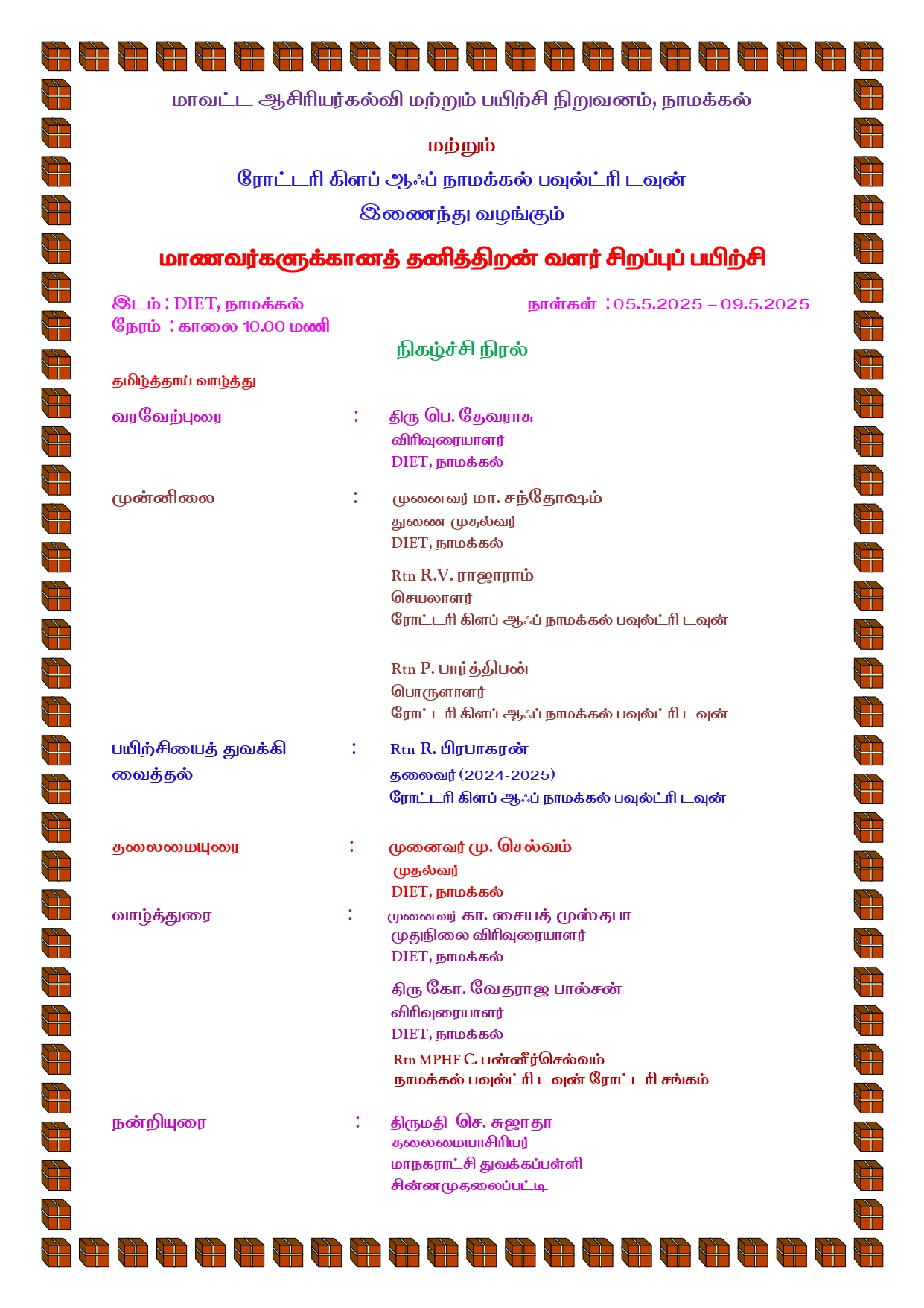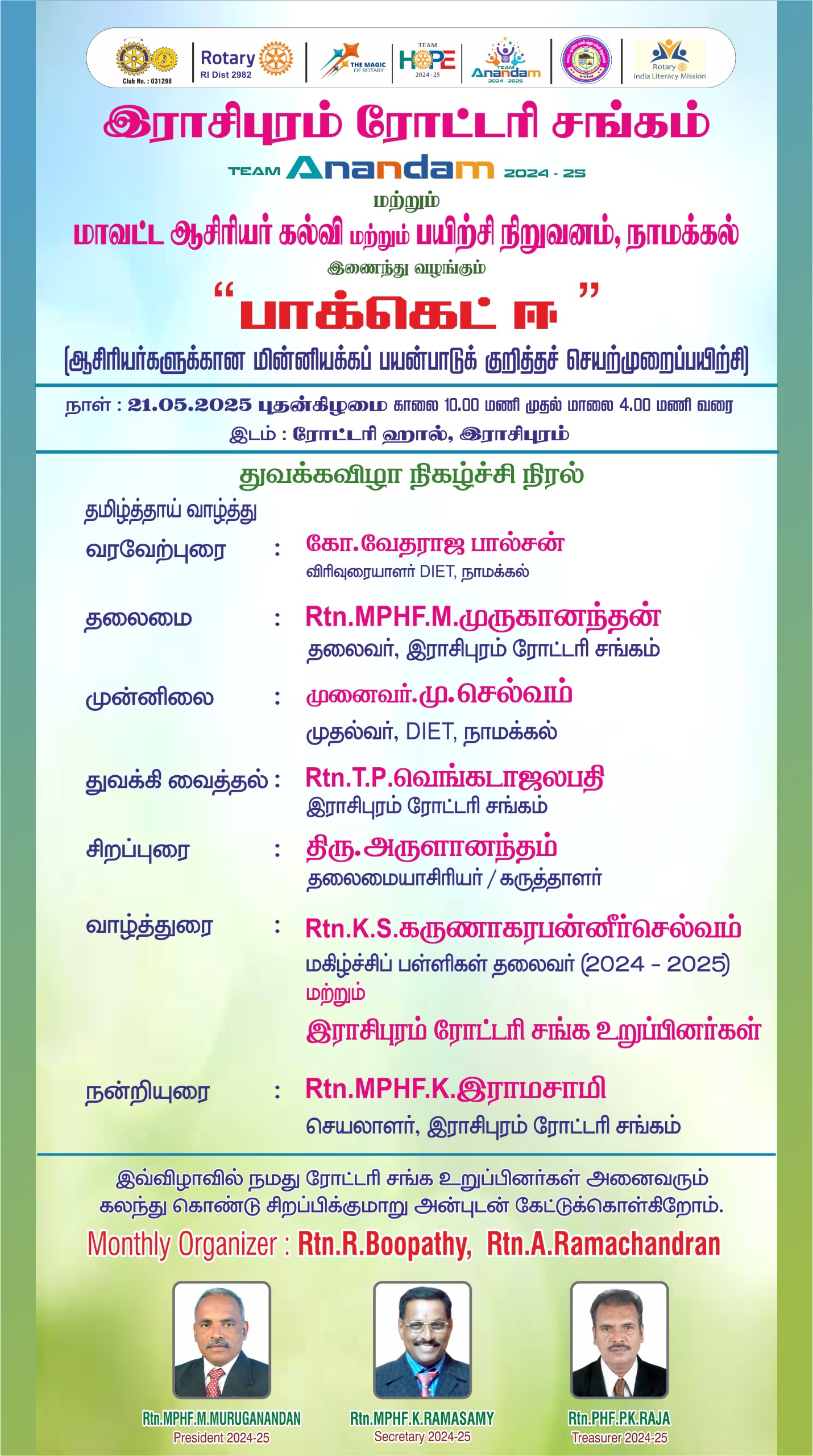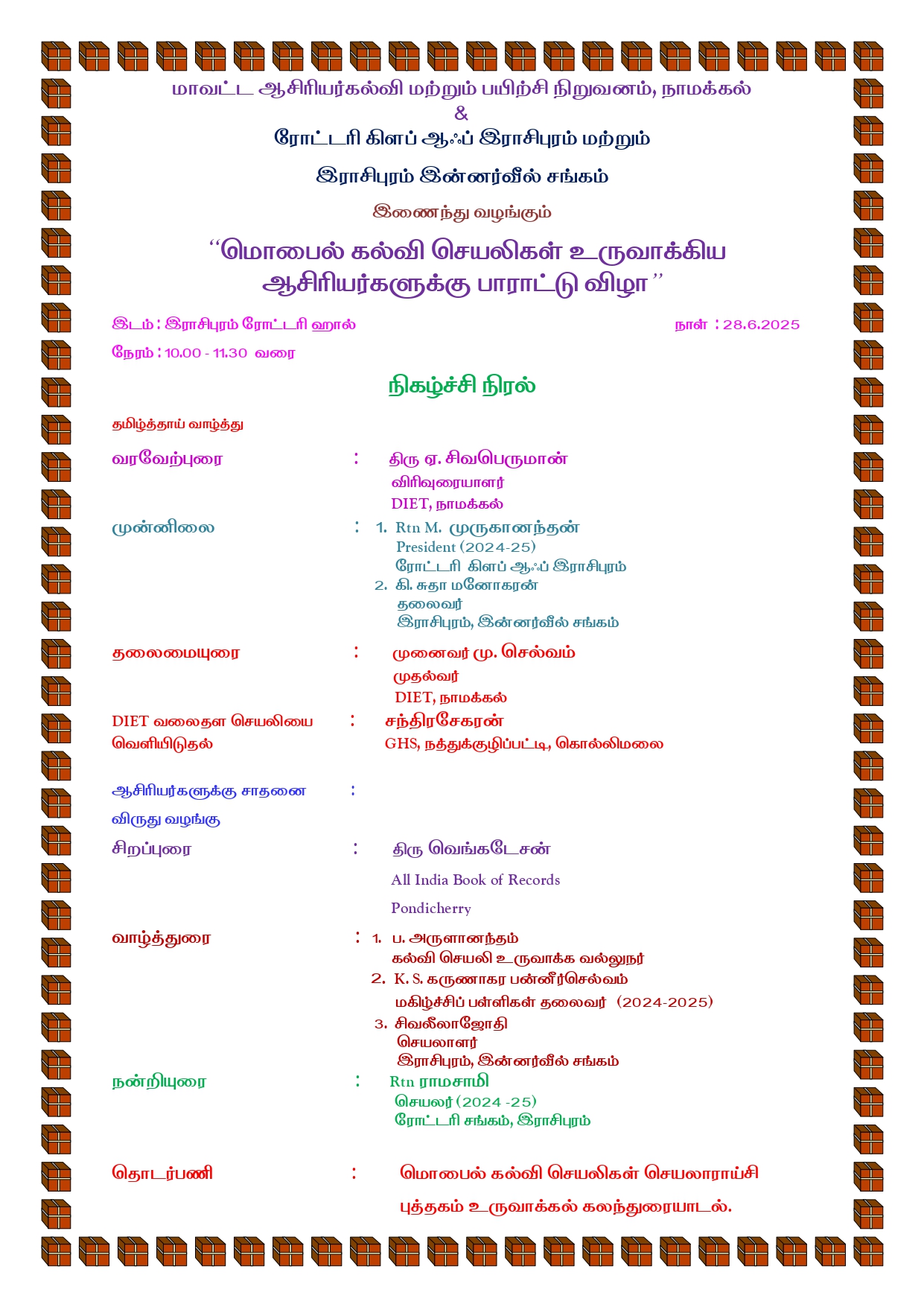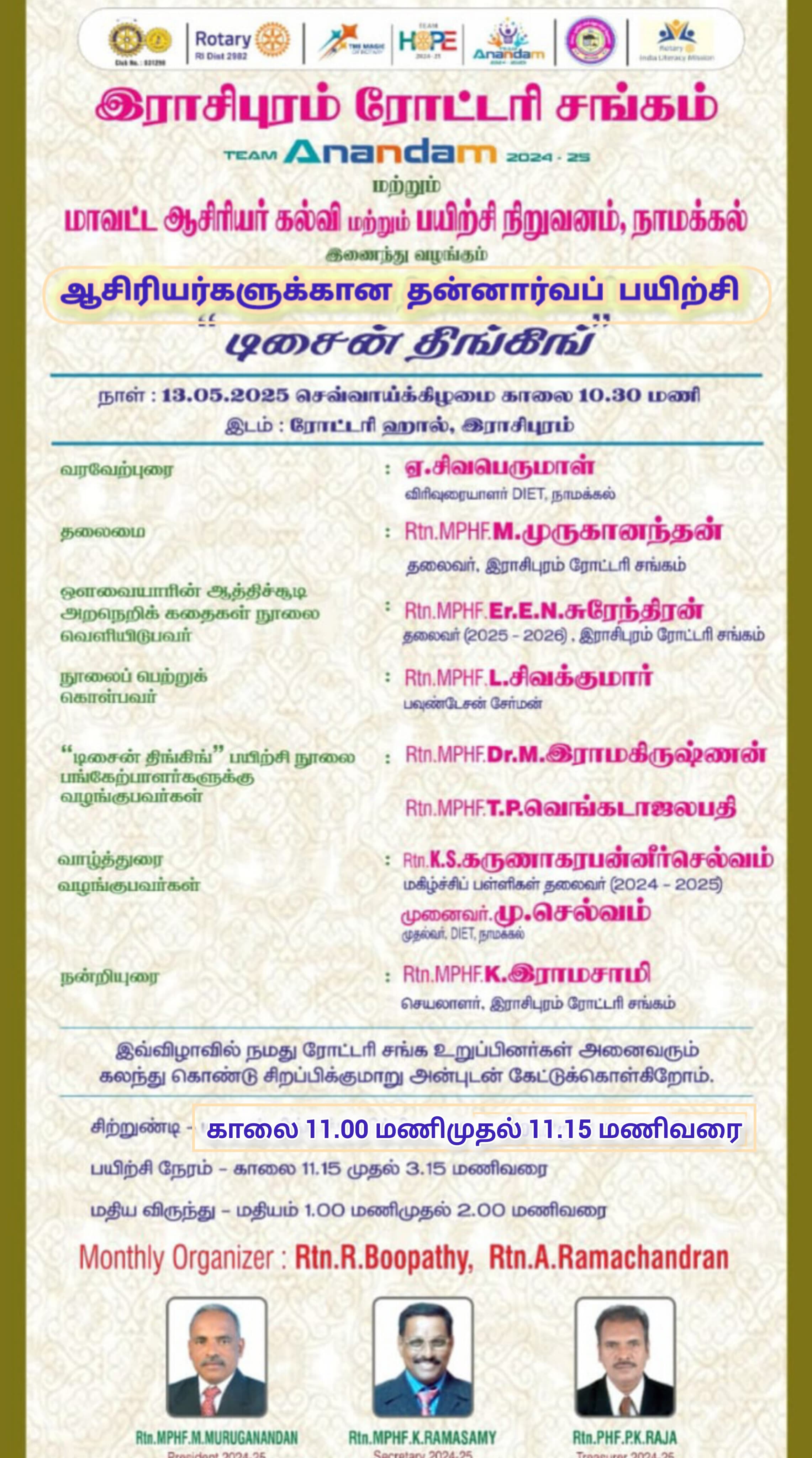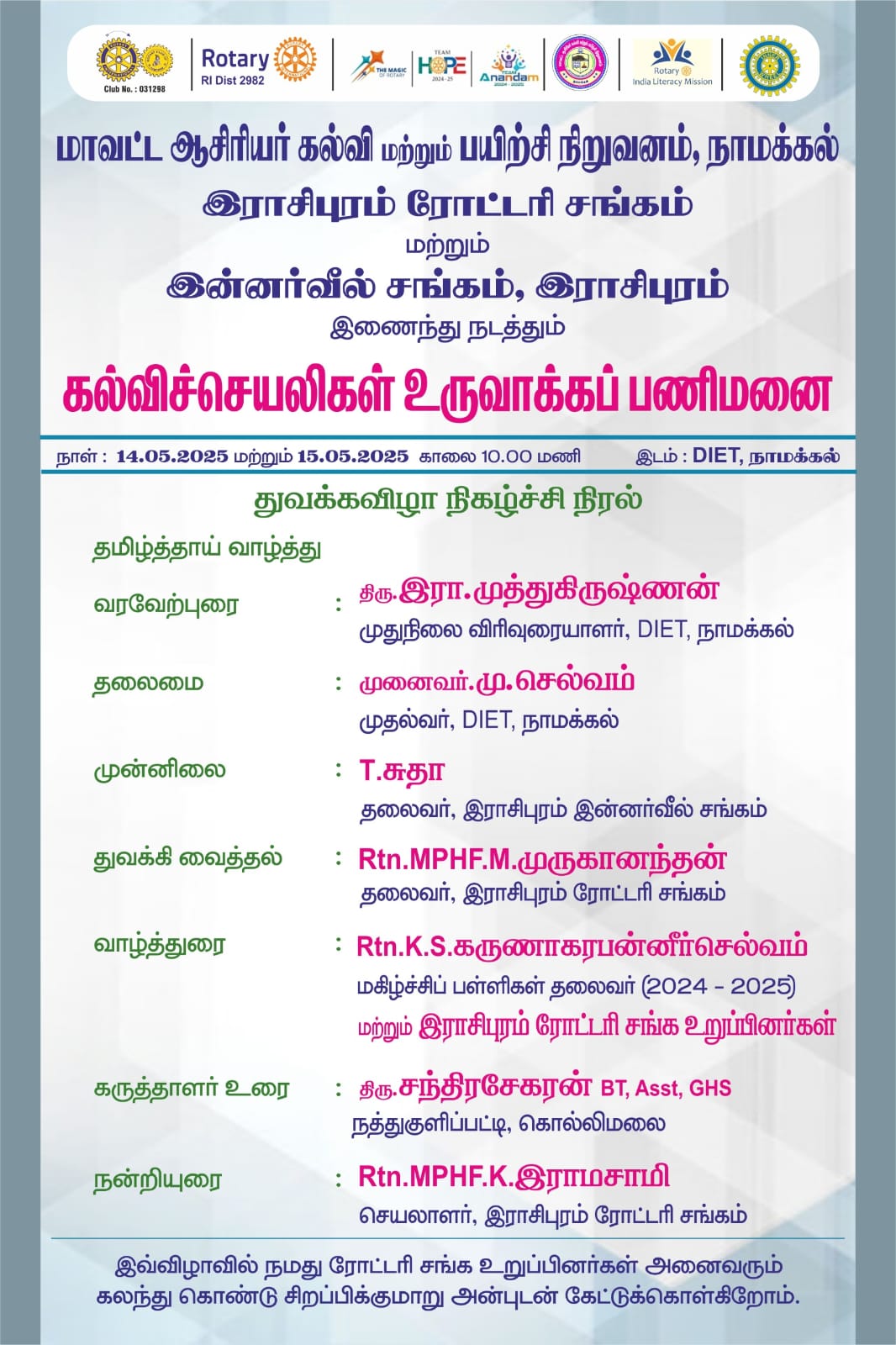 Educational Mobile Apps Development Workshop (Voluntary initiative) was held at DIET, Namakkal from 14.5.2025, 15.5.2025 and 17.5.2025 with the support of Rotary Club of Rasipuram and Innerwheel club of Rasipuram